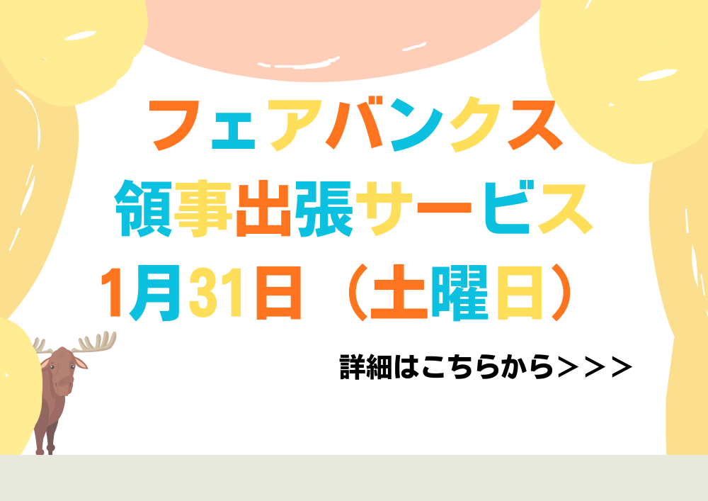 さらに表示する 領事事務所案内 所在地・連絡先 受付時間・休日 領事情報 旅券(パスポート) 戸籍・国籍 各種証明書 子女教育 在外選挙 在留届 マイナンバーカード 査証 領事・旅券手数料 その他 安全情報 安全の手引き 安全対策等 アラスカの治安情勢 領事メール 海外安全情報 パスポートの申請はORRネットから! Visit Japan Web フェアバンクス領事出張サービスのご案内 サンドレイク小学校 日本語イマージョンクラス修了式 デナリ委員会連邦共同議長・ジュリー・キトカ氏への表敬訪問 パーマー高校における日本語学習者修了式・始業式への出席 ダイモンド高校における日本語イマージョンプログラム修了式 浜田所長の日・アラスカ美術展出席 テッド・スティーブンス北極圏安全保障研究センター幹部との意見交換 ニック・ベギッチ連邦下院議員との会合 マイク・ダンリービー・アラスカ州知事との意見交換 スザンヌ・ラフランス・アンカレジ市長への表敬訪問 重要なお知らせ 渡航情報 海外での感染症予防対策 新着情報 一覧へ 令和7年11月26日 【お知らせ】戸籍情報連携システムの定期メンテナンスによるパスポートのオンライン申請等の一時停止 令和7年11月14日 領事出張サービスのご案内(2月28日(土曜日):コディアック) 令和7年11月7日 日本国外の金融機関で年金を受け取っている方への年金支払いに関する手続きのお願い(厚生労働省からのお知らせ) 令和7年11月4日 注意喚起:米国への商用目的渡航について アラスカ日本映画祭の開催(報告) 令和7年10月28日 JAG造船所およびSSRAAふ化場の視察 令和7年10月27日 アラスカ州サックスマン部族代表者との面談 ケチカン市長および姉妹都市交流委員会との面談 令和7年10月22日 千歳アイヌ協会による当地訪問について 令和7年10月14日 アラスカ州西部における強風及び洪水の被害について [185KB] 一覧へ アラスカ・トピックス 閉じる アラスカ事情 アラスカ経済 軍事プレゼンス 美しい自然 イベント情報 閉じる 教育広報(スクールプログラム) 日本―アラスカ関係 閉じる 政治・経済 JETプログラム 姉妹都市 日本語教育 第二次世界大戦の歴史と遺産 日本関係団体 閉じる 日本アラスカ会 日本語教育機関 文化団体 事務所長挨拶 浜田事務所長のご挨拶 SNS 閉じる